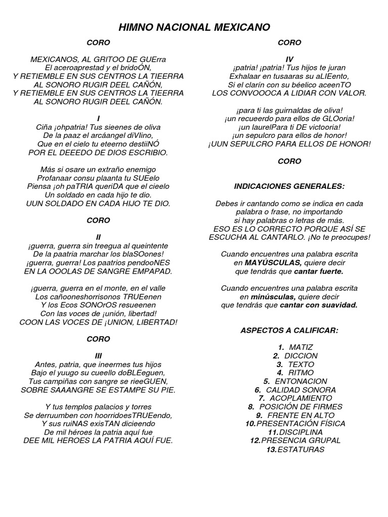 Del Himno Nacional Mexicano que aunque tiene la misma letra que Francisco Gonzlez Bocanegra escribi no lleva el mismo ritmo establecido por Jaime Nun. De acuerdo con el tataranieto de Francisco. LETRA OFICIAL DEL HIMNO NACIONAL MEXICANO CORO Mexicanos al grito de guerra el acero a prestad y el bridn y retiemble en sus centros la tierra al sonoro rugir del can.